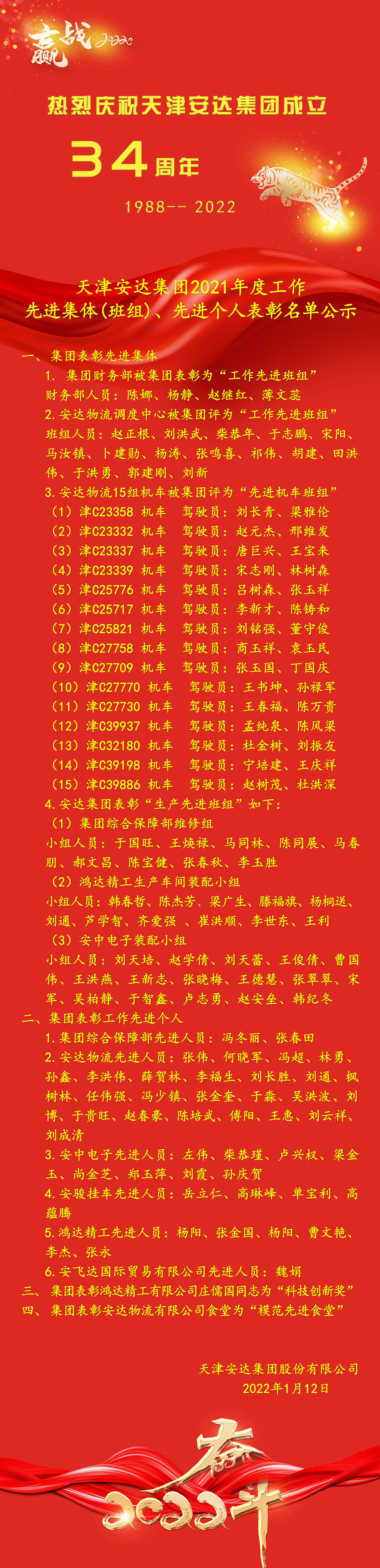 2022年1月13日,天津安达集团成立34周年。原定于当天举办的集团周年庆典暨2021年度工作总结表彰大会,因天津疫情原因临时取消。但集团党委书记、董事长崔洪金仍对全体员工在2021年的努力付出予以表扬,对部分员工的优异表现给予表彰。同时针对目前天津疫情严峻形式,他特别指示集团各分公司要做好疫情防控工作,严密防范疫情传播扩散。