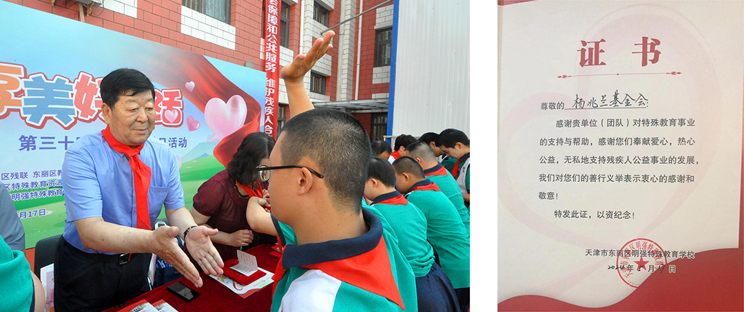 表彰会议在雄壮的国歌声后隆重开始,少先队员代表为各位参会领导、来宾敬献红领巾,孩子们用特殊的方式表达了对各位领导和来宾的尊敬爱戴与热情欢迎。接着,吴会新校长代表学校致感谢词,向一直以来关心、支持学校发展的企事业单位和社会爱心人士表达了诚挚的谢意。“扶残助困,善举济世,关爱生命,回报社会,推动天津市慈善事业发展”是天津市杨兆兰慈善基金会发展的宗旨,自基金会成立以来,已向东丽区民强特教学校捐款100余万元,用于支持本区特殊教育事业。在本次活动的颁奖环节,民强学校吴会新校长特别向安达集团代表颁发证书,以示杨兆兰慈善基金会多年来对特殊教育事业的支持与感谢。