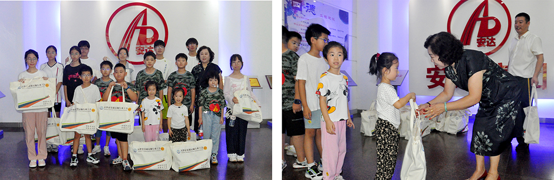 自由活动期间,安达集团工作人员带领孩子们参观企业产业展厅和文化展厅。通过参观,孩子们进一步感受安达集团的文化底蕴与创新精神,对父母所在企业的认同感愈发浓厚。为鼓励孩子们的爱心捐款、肯定他们的慈善之心,郝凤荣理事长为每一位捐款的小朋友发放爱心礼包。